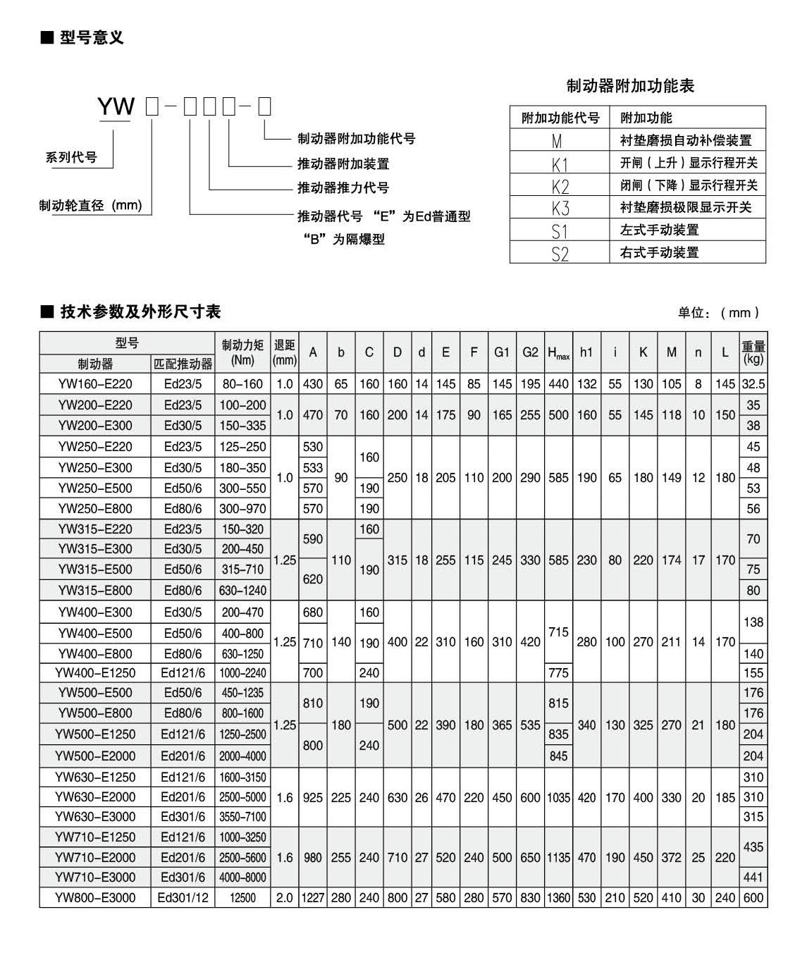 應用:YW,YWZ13系列電力液壓鼓式制動器,廣泛應用于有防爆要求的各種起重運輸、皮帶運輸、港口裝卸、冶金及建筑機械中各種機構(gòu)的減速和停車(維持)制動。符合標準:YW,YWZ13系列電力液壓鼓式制動器的連接尺寸和技術要求符合JB / T6406-2006標準;制動力矩參數(shù)符合DIN15435標準,配套符合DIN15430標準的Ed系列推動器。主要特點:▲ 聯(lián)鎖式退距均等裝置和瓦塊自動隨位裝置,可始終保持兩側(cè)瓦塊退距均等且無需調(diào)整,完全避免因退距不均使一側(cè)制動襯墊浮貼制動輪的現(xiàn)象;▲ 主要擺動鉸點均設有自潤滑軸承,傳動效率高,壽命長,使用中無需潤滑;▲ 制動彈簧在方管內(nèi)布置并設有標尺,用戶可十分方便地讀出制動力矩值,免去測量和計算的麻煩;▲ 制動襯墊為卡裝式整體成型結(jié)構(gòu),更換十分方便、快捷,備有半金屬(無石棉)硬質(zhì)和半硬質(zhì),軟質(zhì)(無石棉)等不同材質(zhì)的制動襯墊供用戶選擇;▲ 配套Ed系列電力液壓推動器產(chǎn)品,動作靈敏、使用壽命長;▲ 常閉式設計,(斷電)彈簧制動,(通電)推動器釋放。工作條件:◆ 海拔高度:<2000m;◆ 環(huán)境溫度:-20°C?+ 40°C;◆ 相對濕度:≤90%;◆ 工作制:間歇性(S3-60%)和連續(xù)(S1);◆ 電源電壓:三相交流,AC380 50Hz (其他電源等級可按需要定制);◆ 有特殊要求時在訂貨時協(xié)商確定。基本參數(shù):● 產(chǎn)品型號:YW-160、YW-200、YW-250、YW-315、YW-400、YW-500、YW-630、YW-710、YW-800● 適用輪徑:160~800mm● 制動力矩:80~12500Nm● 產(chǎn)品型號:YWZ13-200、YWZ13-250、YWZ13-315、YWZ13-400、YWZ13-500、YWZ13-630、YWZ13-710、YWZ13-800● 適用輪徑:200~800mm● 制動力矩:80~12500Nm...